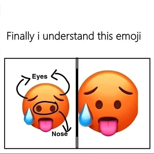 Das Bild zeigt einen Vergleich, der verdeutlicht, wie ein bestimmtes Emoji interpretiert werden kann. Auf der linken Seite ist das Emoji mit Markierungen versehen, die zeigen, dass die beiden Punkte Augen und die ovale Form eine Nase sein sollen. Auf der rechten Seite ist das Emoji ohne diese Markierungen zu sehen. Der Text über dem Emoji lautet: "Finally i understand this emoji."