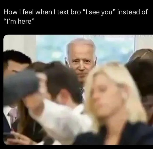 Ein Bild von Joe Biden, der mit einem etwas gruseligen Blick in die Kamera schaut. Im Vordergrund sind die Köpfe von anderen Menschen zu sehen, die unscharf dargestellt sind. Über dem Bild steht geschrieben: "How I feel when I text bro "I see you" instead of "I'm here""