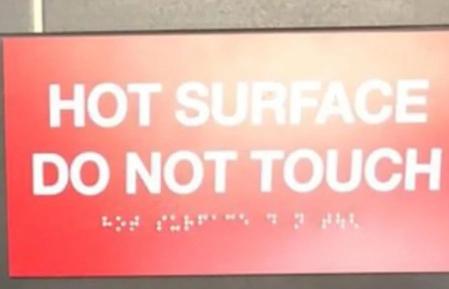 Ein rotes Schild mit der Aufschrift "HOT SURFACE DO NOT TOUCH" in weißer Schrift. Unter der Schrift befindet sich ein Text in Braille.