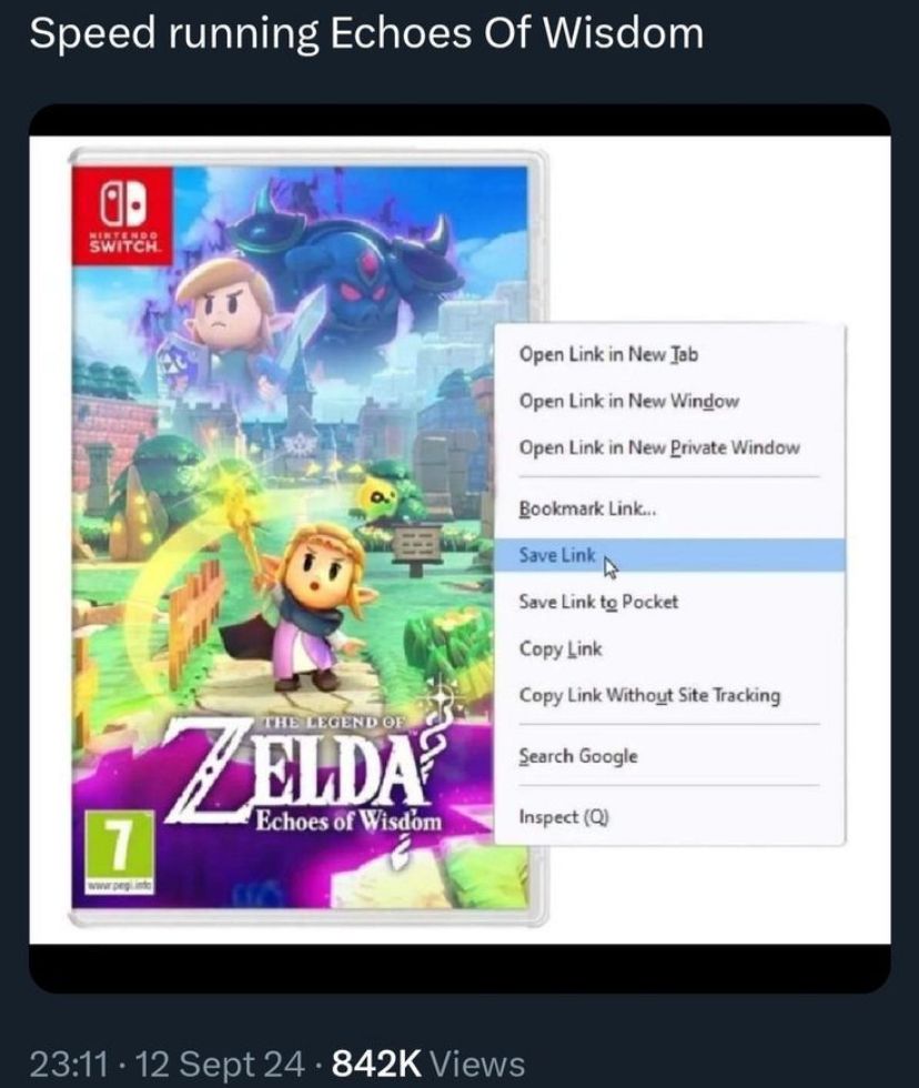 Das Bild zeigt das Cover des Nintendo Switch Spiels "The Legend of Zelda: Echoes of Wisdom" mit einer Browser-Kontextmenü-Überlagerung, die die Option "Link speichern" hervorhebt. Das Spielcover zeigt Link in einem cartoonartigen Stil.
