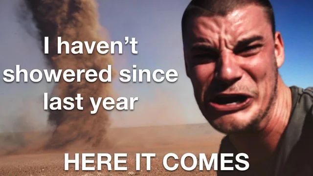Ein Mann schaut mit verzogenem Gesicht auf einen Staubteufel. Der Text lautet: "I haven't showered since last year. Here it comes."