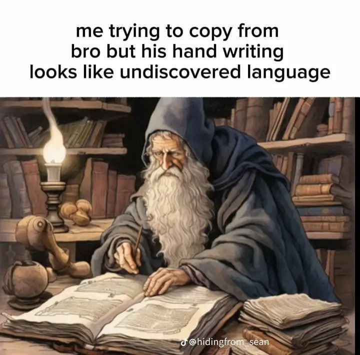 Ein alter Zauberer mit langem Bart und grauer Kutte sitzt an einem Tisch und schreibt in ein großes Buch. Er hat eine Kerze angezündet. Viele Bücherregale stehen im Hintergrund. Der Text im Bild sagt: "Ich versuche, von meinem Bruder abzuschreiben, aber seine Handschrift sieht aus wie eine unentdeckte Sprache."