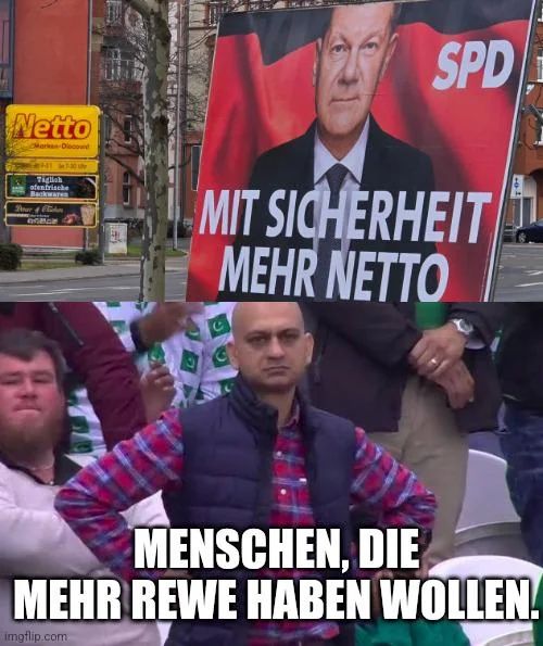 Oben ist ein Wahlplakat der SPD mit Olaf Scholz und der Aufschrift "Mit Sicherheit mehr Netto". Darunter ist ein Mann mit verschränkten Armen, der grimmig schaut. Die Bildunterschrift lautet: "Menschen, die mehr Rewe haben wollen!"