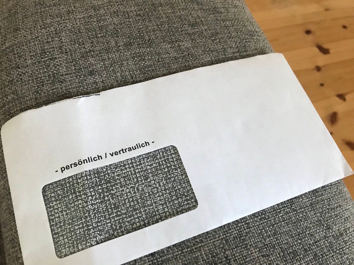 Ein Briefumschlag mit der Aufschrift "persönlich / vertraulich" liegt auf einem grauen Sofa.