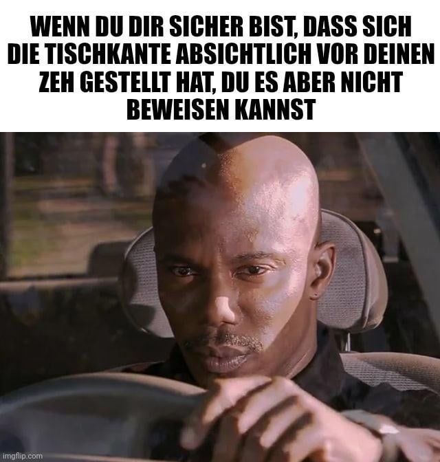 Ein Meme mit dem Schauspieler Larenz Tate, der mit einem ernsten, misstrauischen Blick am Steuer eines Autos sitzt. Der Text oben lautet: 'WENN DU DIR SICHER BIST, DASS SICH DIE TISCHKANTE ABSICHTLICH VOR DEINEN ZEH GESTELLT HAT, DU ES ABER NICHT BEWEISEN KANNST'.