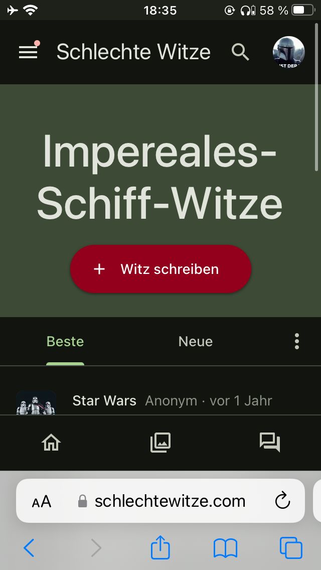 Ein Screenshot von einer Website mit der Überschrift "Imperiales-Schiff-Witze". Ein roter Button mit dem Text "Witz schreiben" ist auch abgebildet. Die Website ist "schlechtewitze.com".