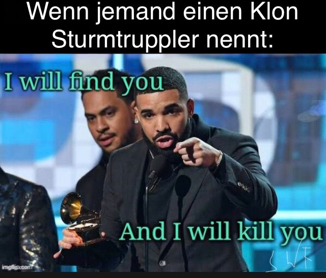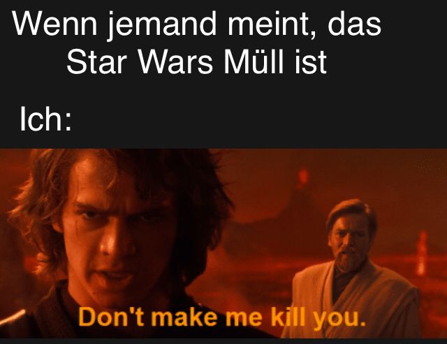 Das Bild zeigt einen Screenshot aus dem Film Star Wars. Über dem Bild steht geschrieben: "Wenn jemand meint, das Star Wars Müll ist". Darunter steht "Ich:" und unter der Filmsequenz steht: "Don't make me kill you." Gezeigt werden in dem Screenshot Anakin Skywalker und Obi-Wan Kenobi in einer bedrohlichen Situation.