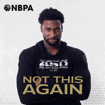 Ein Mann mit dunkler Hautfarbe und lockigem Haar blickt mit verschränkten Armen in die Kamera. Er trägt einen dunklen Hoodie. Im Hintergrund ein heller, einfarbiger Hintergrund. Auf dem Bild steht in goldener Schrift "Not This Again". Oben links ist das Logo der NBPA zu sehen.