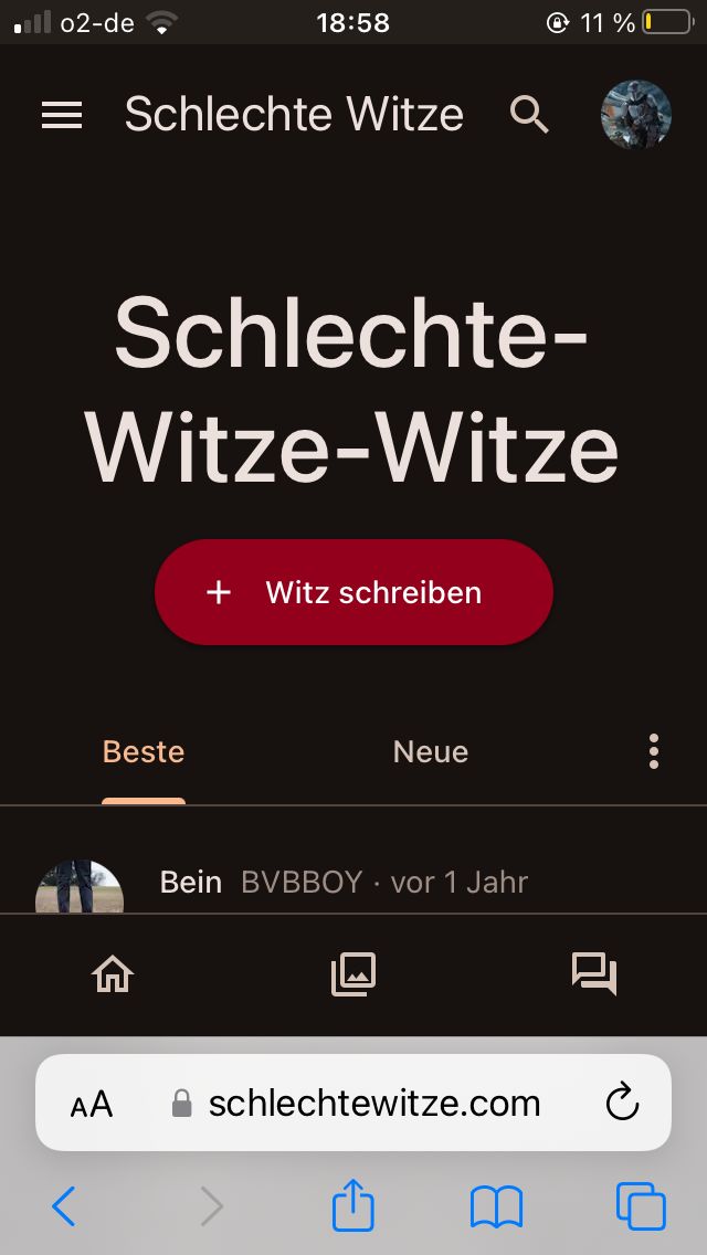 Screenshot einer Webseite mit dem Titel "Schlechte-Witze-Witze" und einer Schaltfläche "Witz schreiben". Unten befindet sich die URL "schlechtewitze.com".