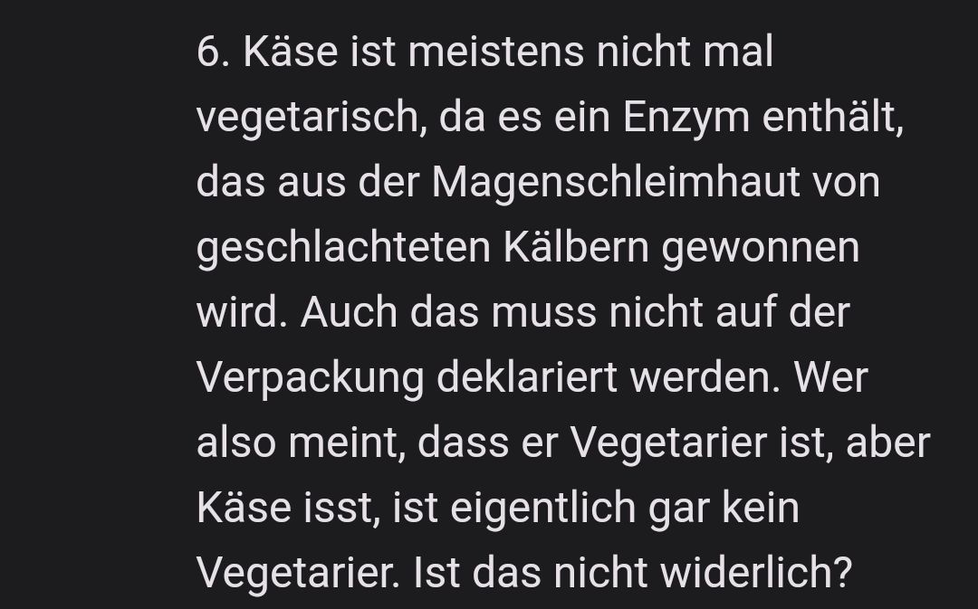 6. Käse ist meistens nicht mal vegetarisch, da es ein Enzym enthält, das aus der Magenschleimhaut von geschlachteten Kälbern gewonnen wird. Auch das muss nicht auf der Verpackung deklariert werden. Wer also meint, dass er Vegetarier ist, aber Käse isst, ist eigentlich gar kein Vegetarier. Ist das nicht widerlich?