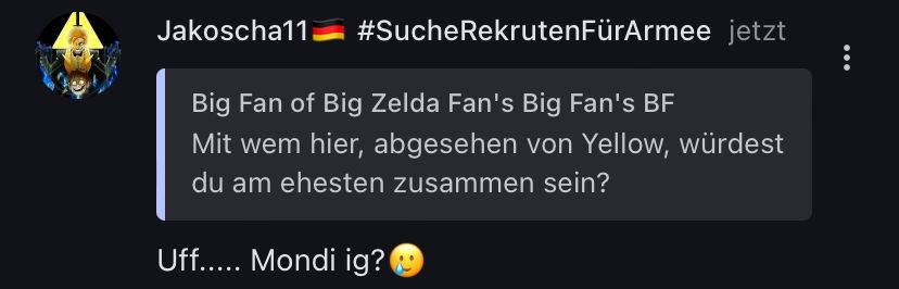 Also, erstens, ich will überhaupt nd mit Jakoscha zusammen kommen und zweitens, selbst wenn ich ihn gut finden würde, wäre wahrscheinlich das extremste, ich würde versuchen mich mit ihm zutreffen, bzw mit ihm privater schreiben