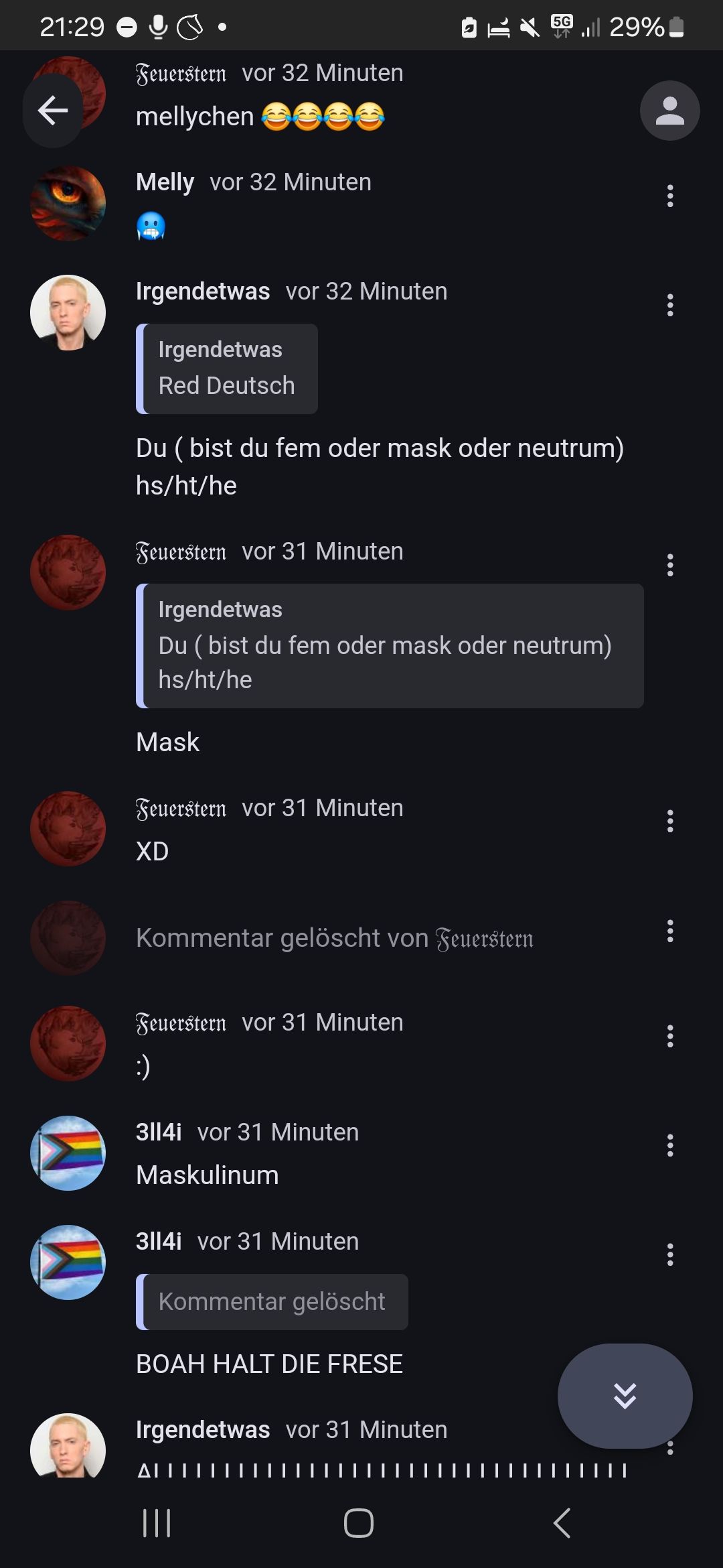 Komm mal runter keiner wollte dich angreifen oder so. Ich bin auch nd homophob oder so aber es fuckt mich ab dass man nicht mal einen witz über lgbtq reißen darf oder so sry aber solche leute haben echt nh fetten stock im arsch und nehmen sich selbst zu wichtig ganz ehrlich
