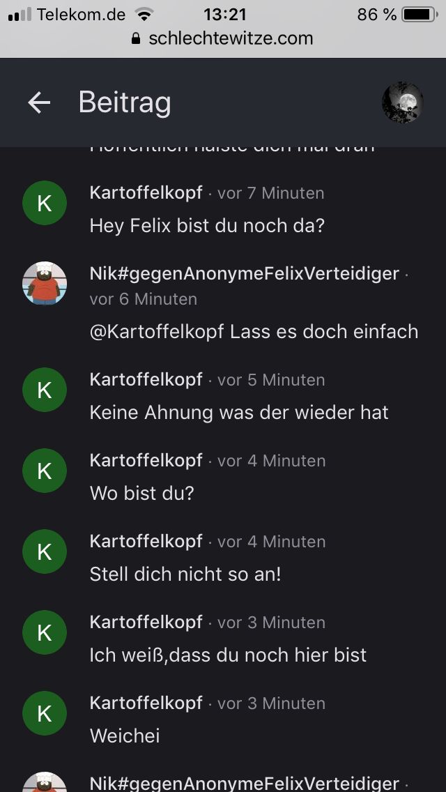 Hahaha ja, das sagt genau der Richtige. Derjenige, der doch selber ständig irgendwelche blöden, perversen, kindischen Sachen schreibt und solche abartigen, hässlichen Bilder schickt. Da braucht er sich nur im Spiegel anzusehen, der Spast, das reicht schon, um festzustellen wer denn unreif ist... 😂 😂 😂 es wäre natürlich auch toll, wenn er sich wirklich verpissen und nie wieder kommen würde, aber solange glaube ich nicht, dass er von hier für immer verschwindet. Felix erstellt doch andauernd neue Accounts...
