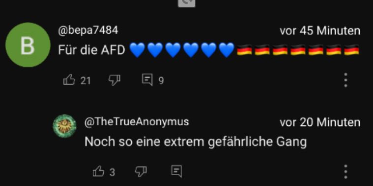 Ich so unter einem wissenswert Video über die gefährlichsten Gangs Deutschlands, wo jemand ohne Grund „für die afd“ kommentiert hat