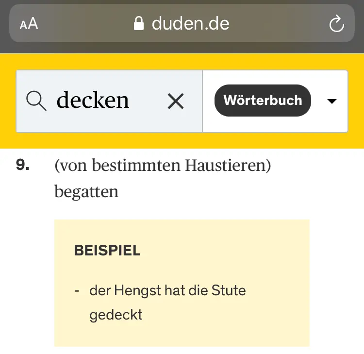 Vereinfacht gesagt, steht bei „decken“ im Duden unter Bedeutungen „9. (von bestimmten Haustieren) begatten“ https://www.duden.de/rechtschreibung/decken