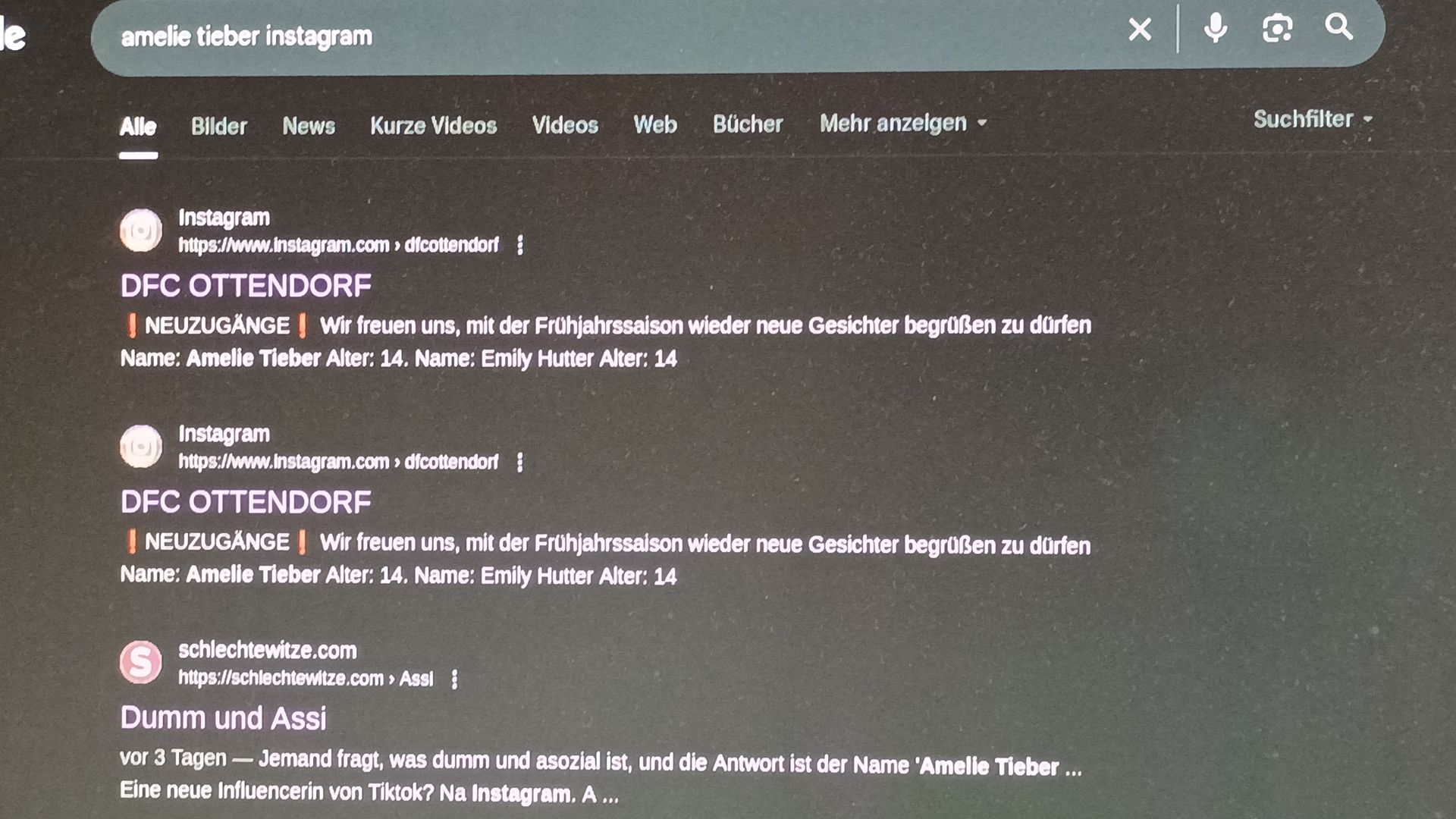 Amelie Tieber ist keine echte Person, du Hirni. Das ist ein Witzname, der auf der Seite Schlechte Witze benutzt wird. Die Seite hat Humor unter der Gürtellinie und Witze, die so dumm sind, dass sie schon wieder intelligent sind. Aber es gibt tatsächlich eine Amelie Tieber, die Fußball spielt. Aber das ist eine andere, du Dummkopf.
