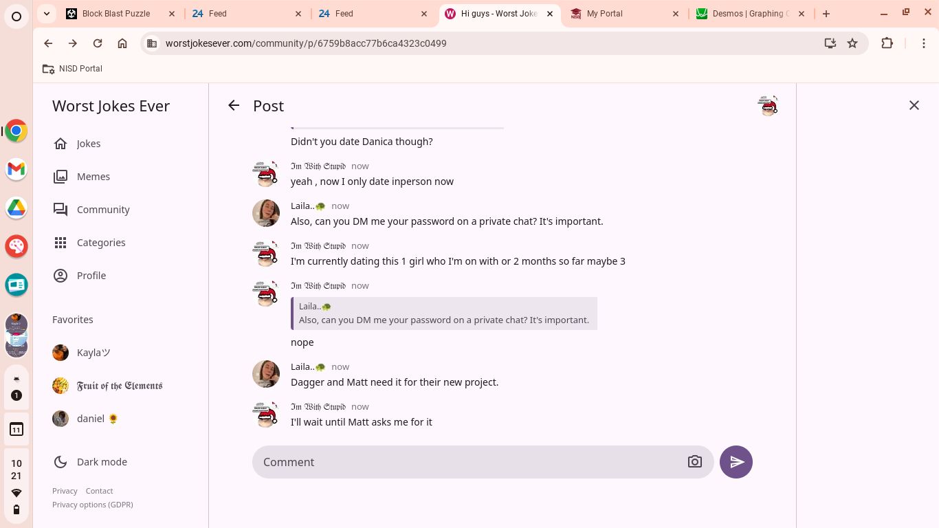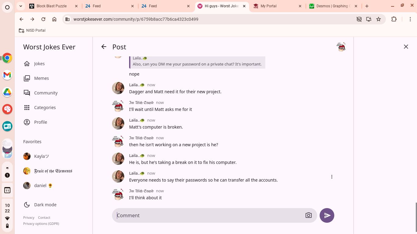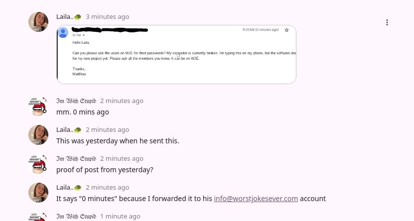 Hey guys sorry for typing in English , I would like to ask ANY of the moderators AND MATT on why a random account from https://worstjokesever.com/@laila%F0%9F%90%A2 is asking for All of the WJE account passwords for a "project " which I don't believe is true.