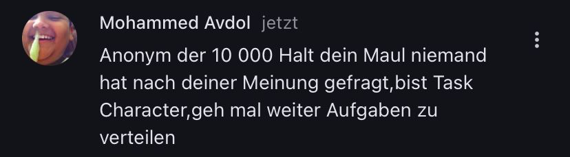 Anonym der 10 000 Halt dein Maul niemand hat nach deiner Meinung gefragt,bist Task Character,geh mal weiter Aufgaben zu verteilen