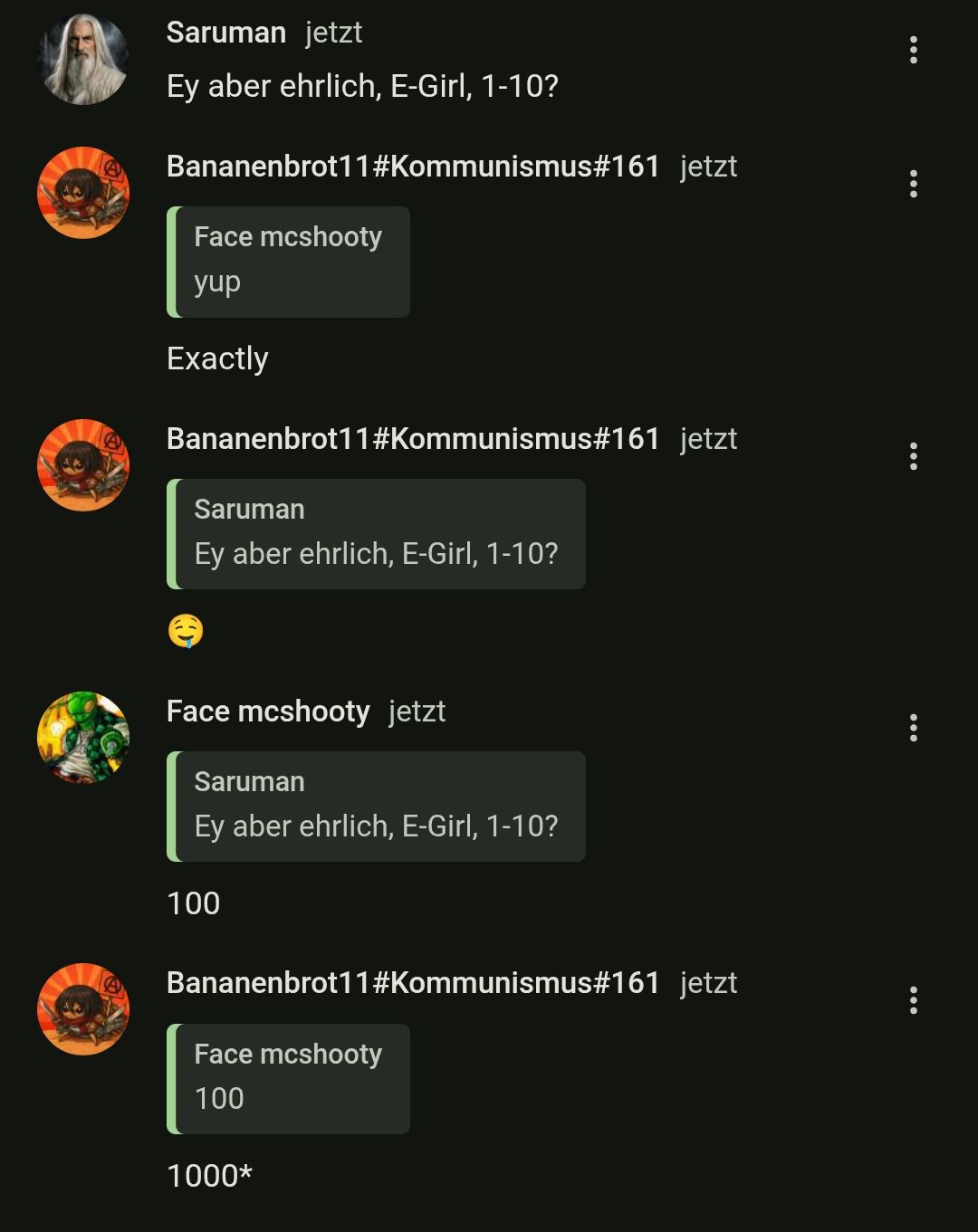 Als Gentleman finde ich es amoralisch und inkorrekt, das Selbstwertgefühl von Frauen mit Zahlenwerten anzugreifen. Als Keks… habe ich keine Ahnung, was ein E-Girl sei. Soll. Electro? ein Roboter? :,)