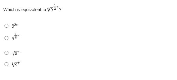 $\sqrt{9^{\frac{1}{2}x}}$ ist nichts anderes als $(9^{\frac{1}{2}x})^{\frac{1}{4}}$. Da multiplizierst du die Exponenten: $\frac{1}{2}x \cdot \frac{1}{4} = \frac{1}{8}x$.