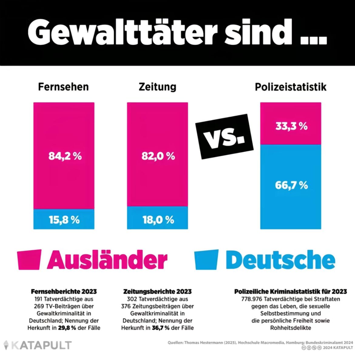 Ich frage mich, was man mit solchen Statistiken aussagen will. Der größte Teil der Gewaltkriminalität ist für die Allgemeinheit überhaupt nicht relevant (irgendwelche Kneipenschlägereien, was weiß ich...). Wenn Deutsche über den Weihnachtsmarkt fahren oder wahllos Leute abstechen, wird darüber selbstverständlich auch berichtet.