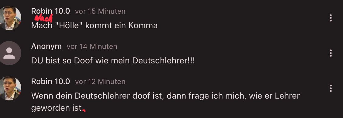 Robin mein Lehrer ist Lehrer geworden weil er den Direktor bestochen hat!!!
