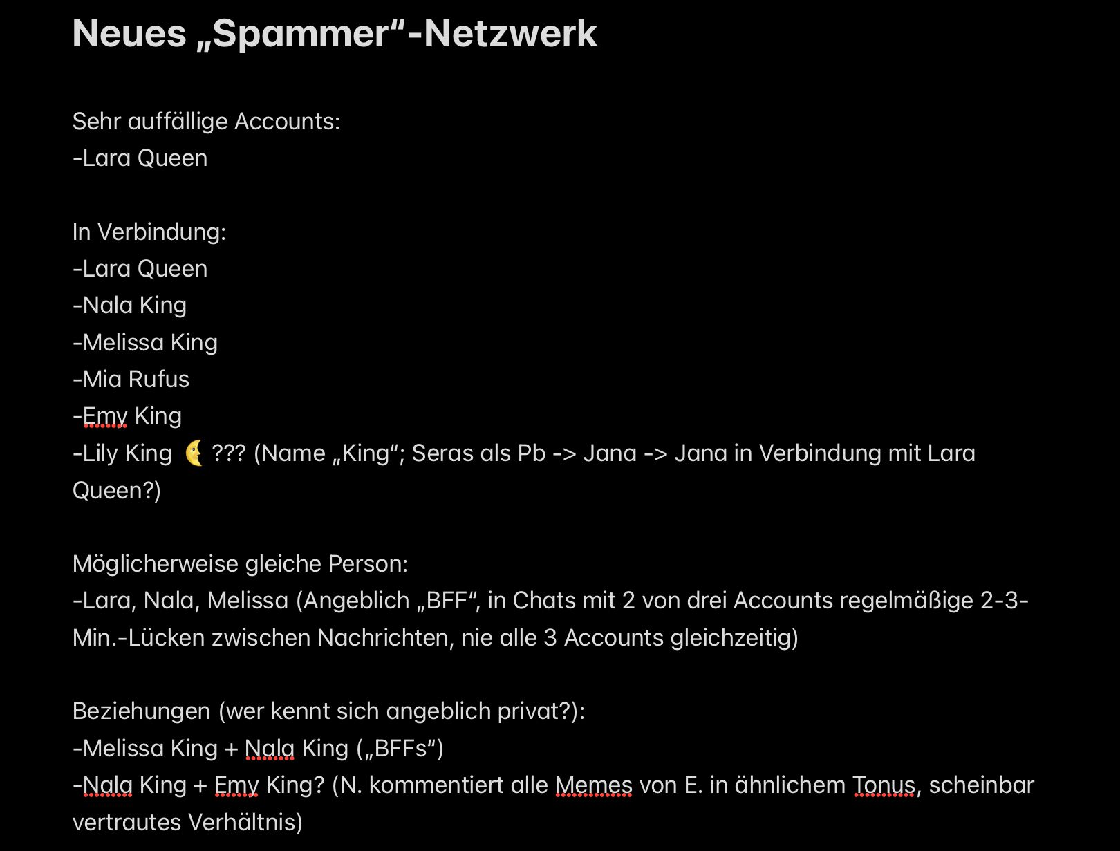 Ich denke nala King und melissa King sind zwei unterschiedliche Personen, da beide einmal ca. 1 Stunde gechattet haben. (Ohne andere Personen anwesend) Ich glaube nicht das irgendjemand das machen würde… ausserdem liegen die registrierdaten auseinander