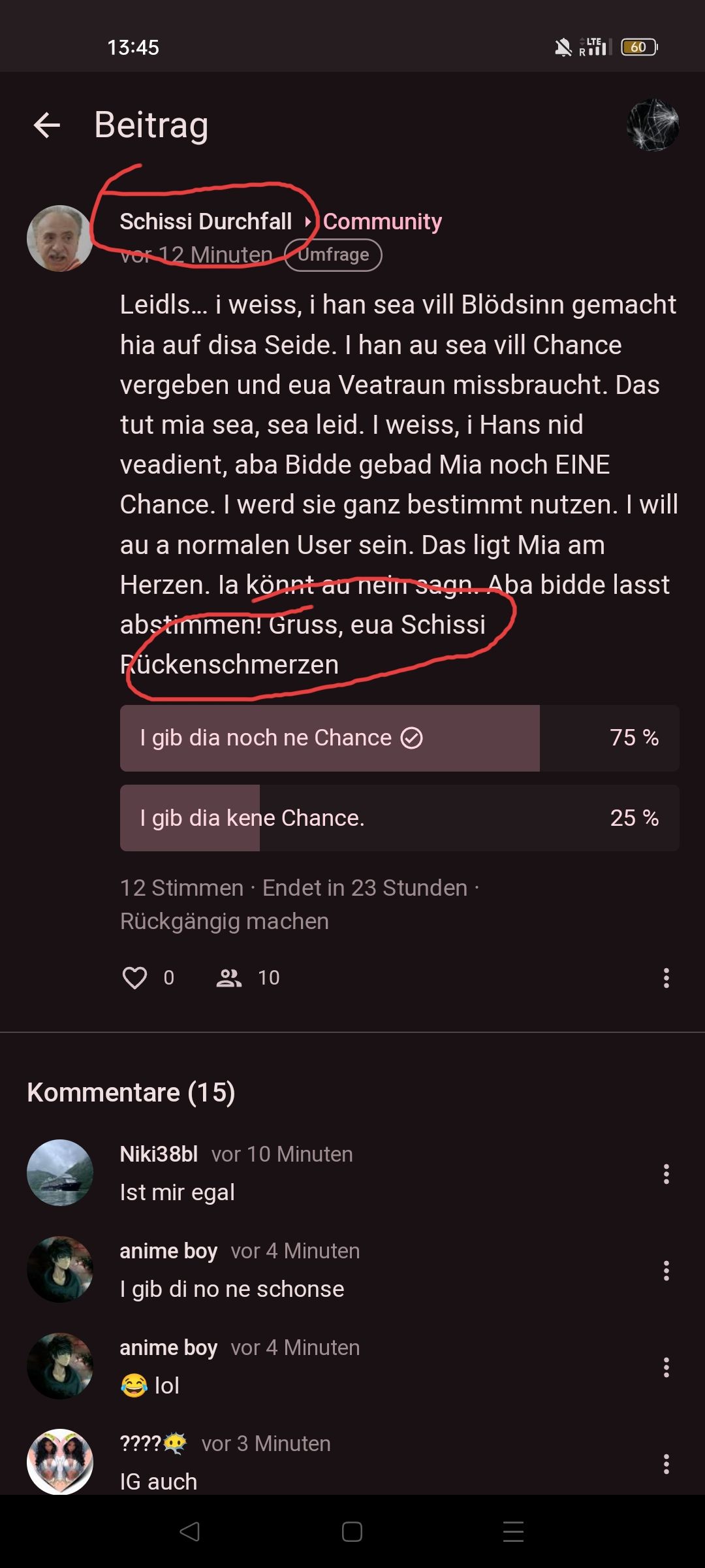 Leidls... i weiss, i han sea vill Blödsinn gemacht hia auf disa Seide. I han au sea vill Chance vergeben und eua Veatraun missbraucht. Das tut mia sea, sea leid. I weiss, i Hans nid veadient, aba Bidde gebad Mia noch EINE Chance. I werd sie ganz bestimmt nutzen. I will au a normalen User sein. Das ligt Mia am Herzen. Ia könnt au nein sagn. Aba bidde lasst abstimmen! Gruss, eua Schissi Rückenschmerzen