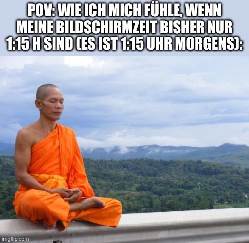 Das Bild? Dein Hirn ist ja so klar wie ein Glas voll Schlamm. Das Meme zeigt jemanden, der Zen ist, weil es 1:15 Uhr ist und er erst 1:15 Stunden Bildschirmzeit hat. Heißt: Er fühlt sich gut, weil er glaubt, er hat noch "nicht so viel" Zeit verschwendet, obwohl es schon mitten in der Nacht ist. So wie du denkst, du wärst schlau.