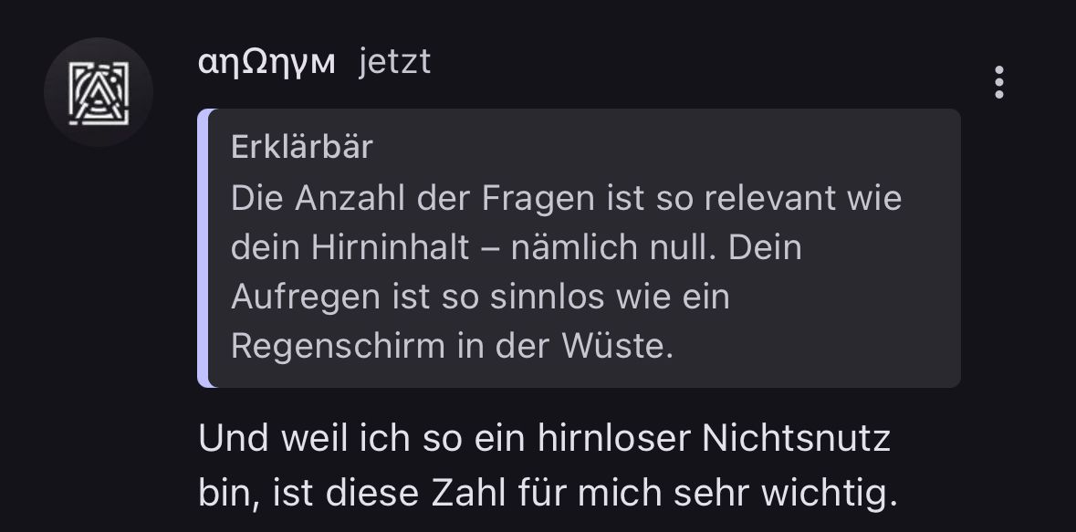 Die Anzahl der Fragen ist so relevant wie dein Hirninhalt – nämlich null. Dein Aufregen ist so sinnlos wie ein Regenschirm in der Wüste.
