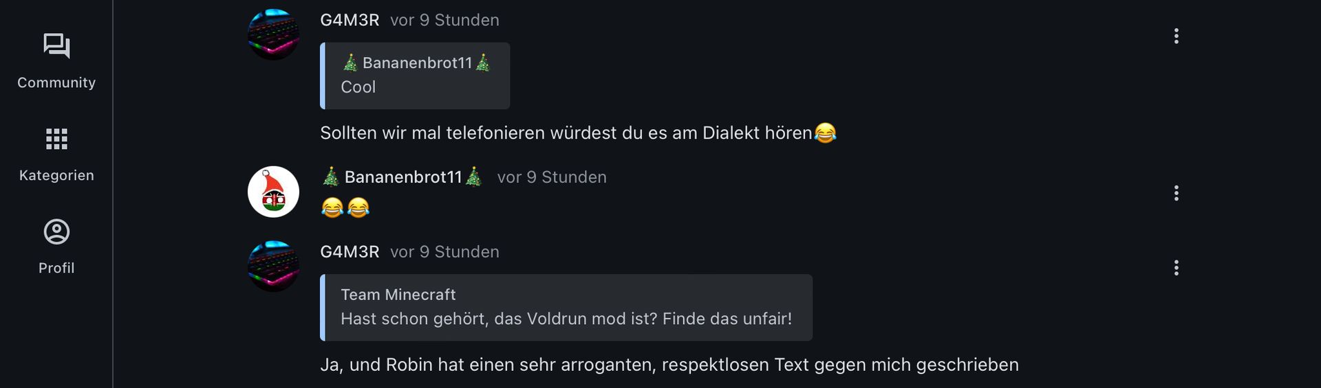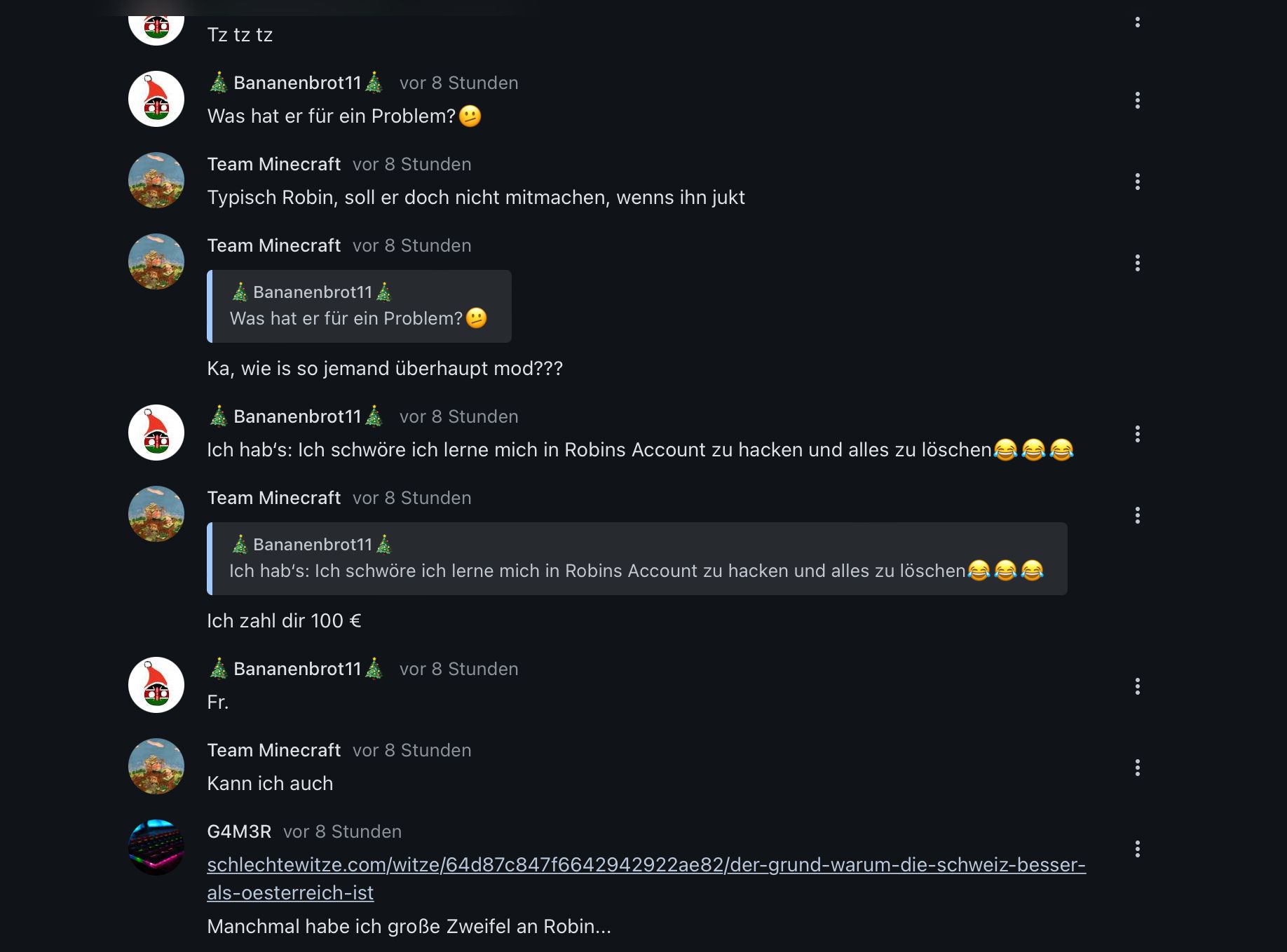 Von Team Minecraft: 😅🗿 -> Antwort auf den Kommentar von Bananenbrot: "Ich hab ihm „Du Opfer“ und „wandelnde Intelligentslücke“ ins Gesicht gesagt" Ja ihr beide seid ja auch echt krass. Beleidigt jemanden und findet das cool. Ihr verhaltet euch gerade kein Stück besser als die "Officel" oder "Jana" Accounts von dem was ich da sehe." Meine Stellungnahme: 1) Robin hat schon ein sehr hohes Ego... Und das sagen nicht nur ich, Babro und Gamer 2) Argumente... Nennt IHR mir zuerst mal Argumente, warum ihr so Respektlos die regel missachtet, die ich gesetzt habe. 3) Ob Robin sich als Mod eigenet oder nicht, er hat um gottes willen in letzter zeit schon viel scheiss geschrieben/gemacht 4) Gefällt mir, dass du uns so krass findest. Am besten nimmst du dir mal ein beispiel an uns... Fazit -> Du willst dich bei den mods und Robin lieb kind machen...