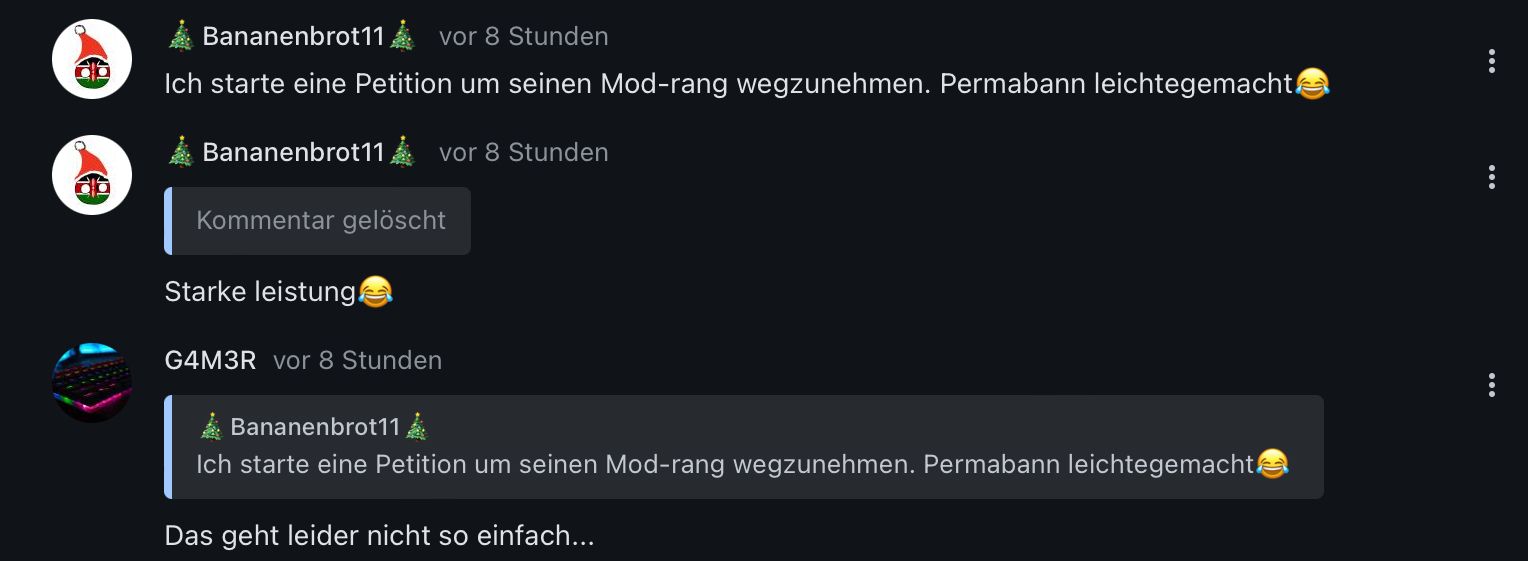 Von Bananenbrot: "Ich habs: man muss eine Theoretische Prüfung absolvieren um danach einen Monat lang die Praktische Prüfung zu machen und erst dann ist man Mod. Alle mods müssen beides wiederholen😂👌🏻" du meinst, damit die Aufstellung so bleibt wie sie ist und ihr beim probieren nochmal bestätigt bekommt, dass ihr euch nicht eignet als Mod?