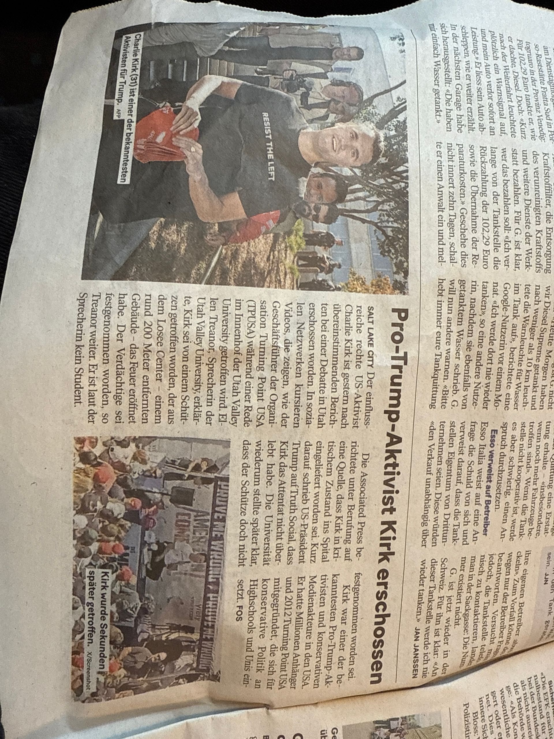 Wenn ein random Bürger durch Waffengewalt stirbt, trauert außerhalb des Umfelds der Opfer keine Sau drum, und jetzt redet die ganze Welt über Charlie Kirk? Ein Befürworter von Waffen, der selbst meinte, dass Todesfälle durch Waffengewalt ein akzeptabler Preis seien, wenn es dafür weiterhin das Recht auf Waffenbesitz gibt…ich bleibe bei meiner Aussage, dass der Tod nicht die richtige Lösung ist, aber bleibe auch dabei, dass ich keine Worte der Trauer von mir geben werde