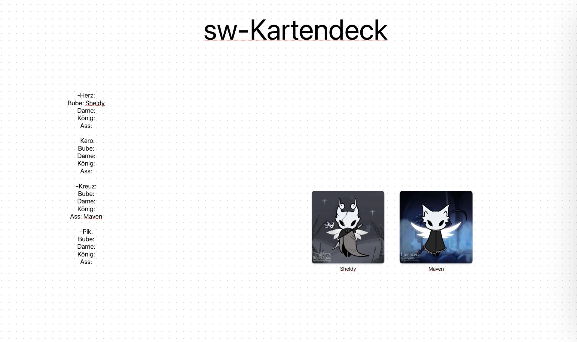 Da wir gerade alle hier sind, wenn noch jemand in das sw-Kartendeck einziehen will, hier eine Karte für sich erstellen (wir haben uns auf den Generator geeinigt, den Feinschliff mache ich dann am Ende) https://picrew.me/en/image_maker/143336 und mir sagen, wo er sie haben will (Bube, Dame, König, Ass / Herz, Karo, Pik, Kreuz)