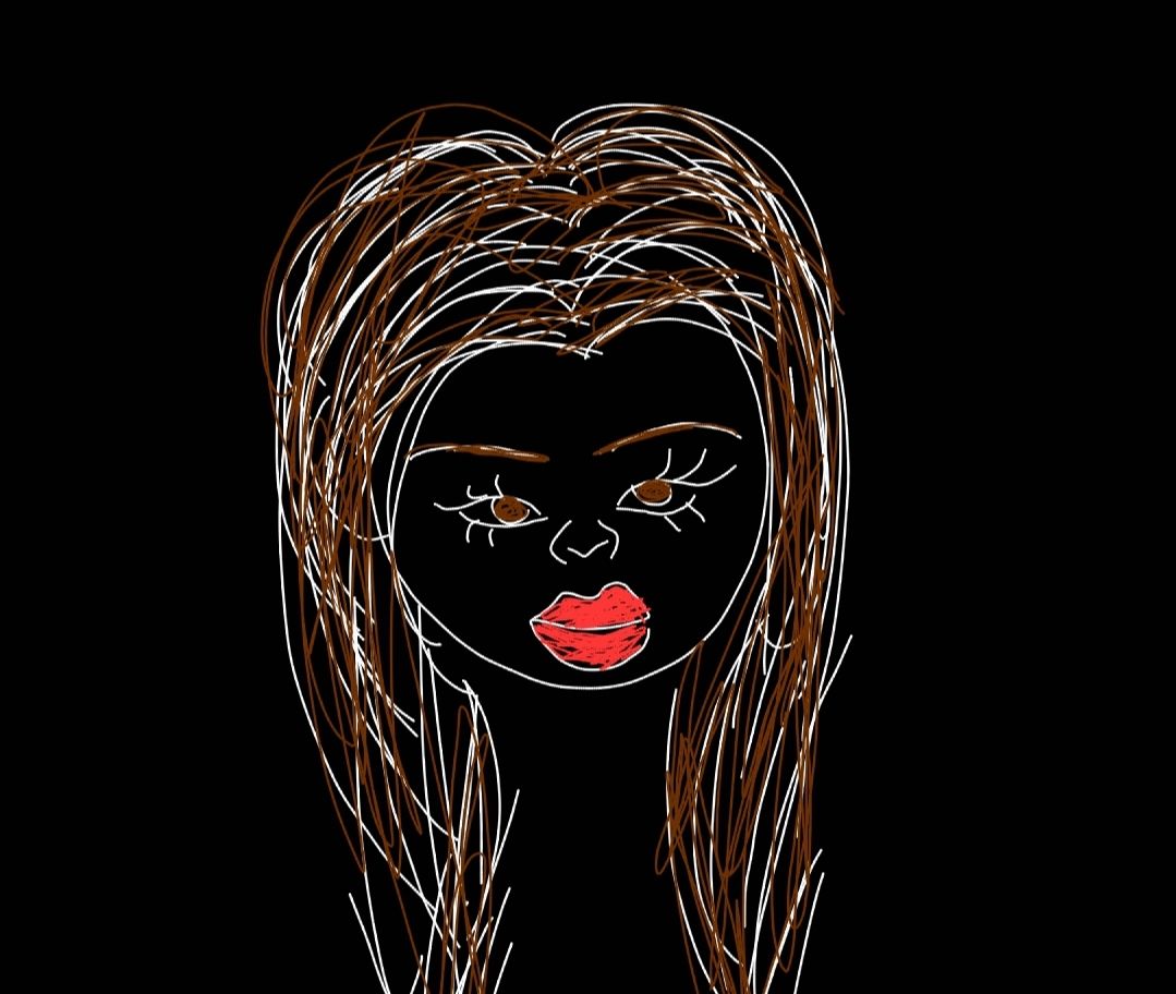 Blau, große Augen, gestrichelter Mund.