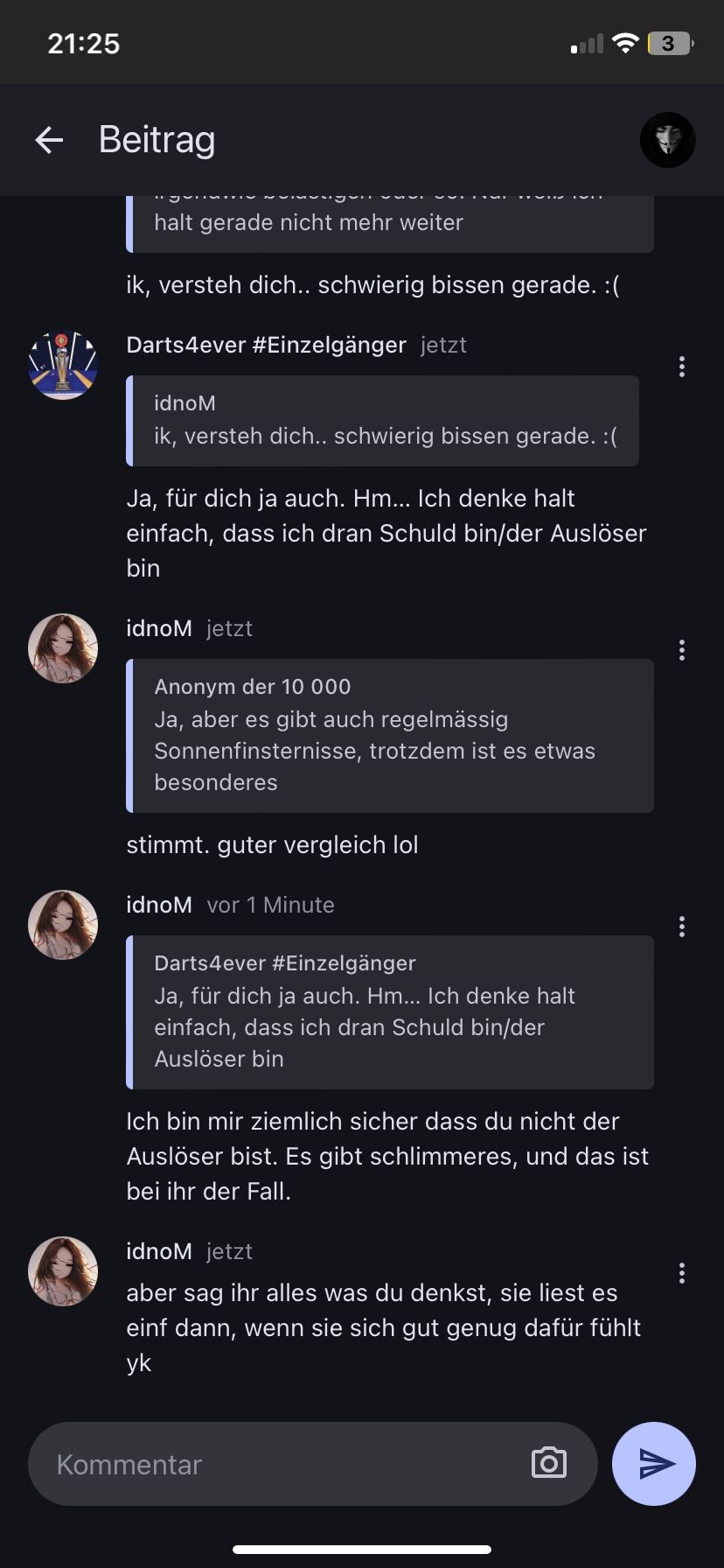 Ja, schon. Brauchte halt einfach ne zweite Meinung, weil alleine hätte ich das nicht entscheiden können. Also schon, aber halt nicht so, als das ich mich nicht noch schlechter fühle als ohnehin schon, yk?