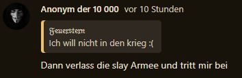 „Willkommen bei der Slay_Armee, wir setzen uns ein für die Rechte der Soldaten“… einfach nein. Ohne Krieg und Armee keine Soldaten, ohne Soldaten keine Notwendigkeit für den Schutz von Soldatenrechten.