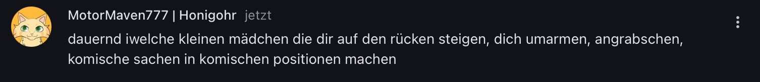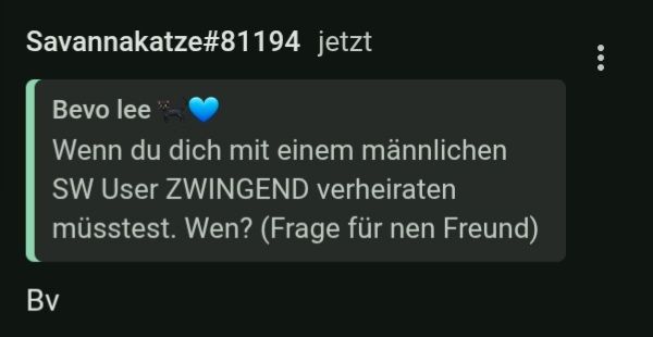 Mhh schwer also dafรผr mรผsste ich bissl mehr von paar Usern wissen.. ne Spass, also eig Aussehen spielt keine grosse Rolle, aber ich mag so dunkle oder dunkelblond aber yk weil ich hab nie nen Typen mit ner anderen Haarfarbe gesehen hab an dem ich interesse hab und joa, eif bissl grรถsser als ich. Charaktereigenschaften.. selbstsicher aber nd arrogant, so seinen Taten bewusst sein und die Konsequenzen kennen und respektvoll sein. Alter ist Maximum 16, musste in letzter Zeit bissl runterschrauben...