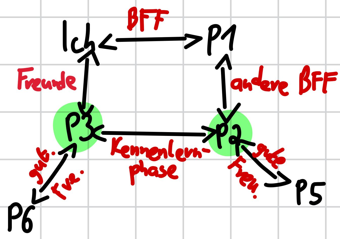 Also, P2 (weibl.) und P3 (männl.) haben aktuell Kennenlernphase, und wollten sich, zusammen mit P1 (weibl.) im Freibad treffen. Damit P3 nicht alleine ist, und da ich der beste Freund von P1 bin, hat er mich gefragt, ob ich mitgehe. Er hat dann außerdem noch spontan P6 mitgebracht. P2 wollte sich an dem Abend eigentlich noch mit P5 (mögl. Kennenlernphase mit mir) treffen, die ist dann aber auch einfach mitgegangen.