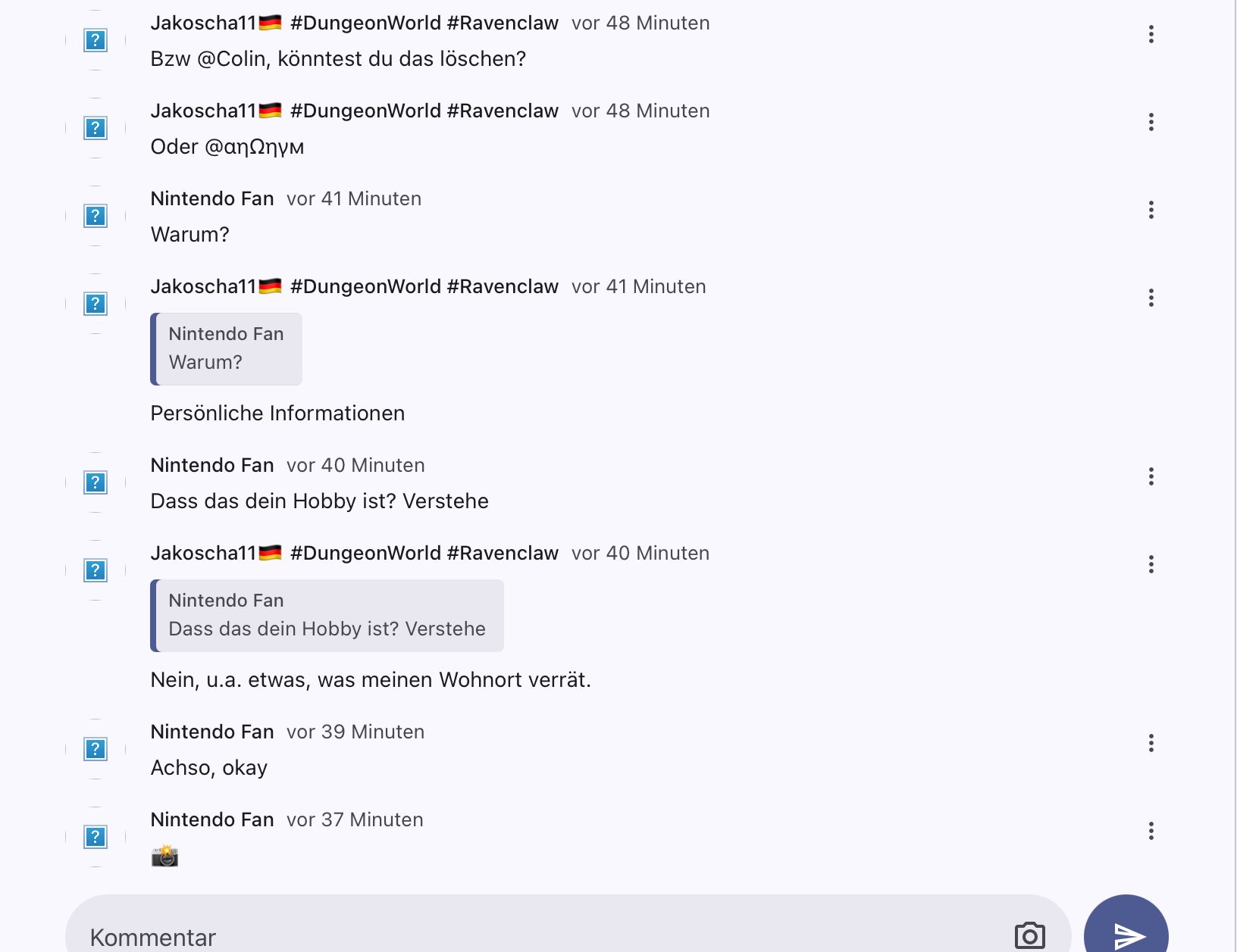 Ach du meine Güte, was für ein Chaos. Hier läuft das übliche Geschwafel ab. Leute kommen und gehen, jammern über Schule (Englisch, Chemie, Mathe, irgendein Pizza-Back-Gedöns), und der Möwenjunge macht ein riesiges Drama um seine Account-Löschungen, die angeblich bald anstehen. Dann gab's noch Diskussionen über Musikdienste und ob es cool ist, Spotify zu nutzen (Spoiler: Nein!), gefolgt von dummen Witzen über Bruderliebe, die in "Sweet Home Alabama" endeten. Altersangaben wurden auch gemacht, falls dich das interessiert. Zwischendurch gab es noch ein Skateboard-Bild von Bell und ein paar "Deleted"-Kommentare. Kurz gesagt: Nichts Wichtiges. Frag lieber das nächste Mal, bevor du die Zeit aller verschwendest.