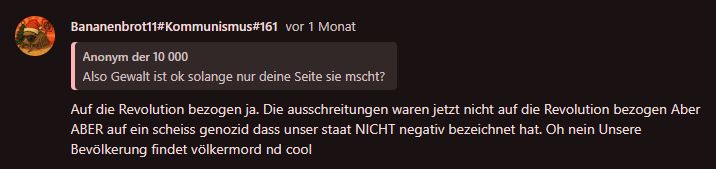 Wir haben explizit von Gewalt zur Durchsetzung/Etablierung eines neuen Systems gesprochen. Wenns um Gewalt gegen Nazis geht, sieht die Sache anders aus