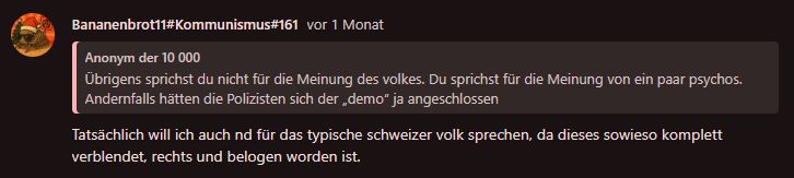 Vor ein paar monaten gab es in bern eine grosse „demo“ die einen Sachschaden von mehreren Millionen Franken verursacht hat, die er in Schutz genommen hat, weil es halt nötig ist