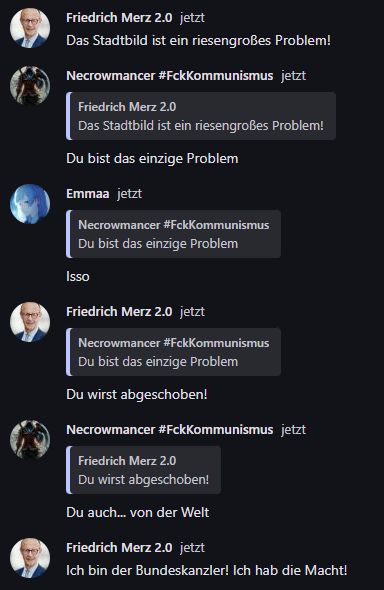 5. Zum Schluss kam noch so ein Möchtegern-Merz-Klon ("Merz 2.0") und hat versucht, alle abzuschieben. Necrowmancer hat mich ernsthaft gefragt, ihn zu deportieren. Meine Antwort? Keine Politik, keine Abschiebung. Immer!