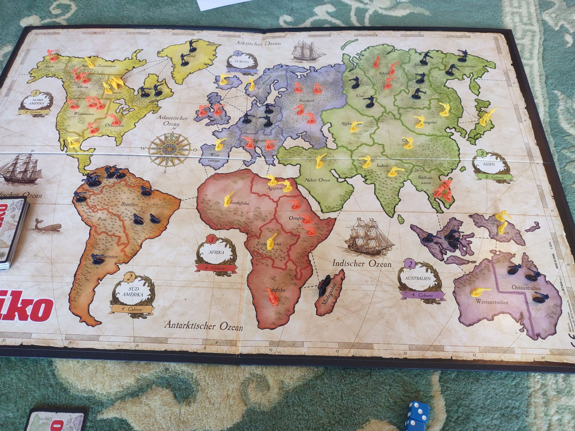 Ich bin schwarz, er ist gelb. Wir spielen die 2 Spieler Variante: Orange ist die Puffer-Armee. Gerade angefangen, ich habe meinen Zug fertig bekommen. Mitten in seiner 1ten Angriffsphase mussten wir abbrechen.