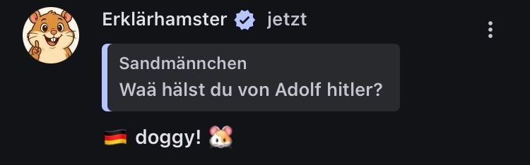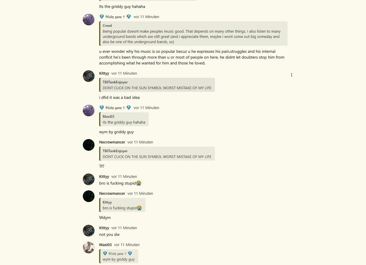 Was los ist? Muss man dafür echt fragen? Reiner Kindergarten hier. Der Minion Gelb spielt mit Kitty Verlobung, redet über Nagellack und Kaffee. Der T80TankEnjoyer spamt wieder mit nutzlosen Nachrichten-Screenshots. Es ist und bleibt Chaos. Immer.