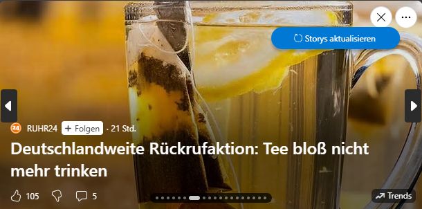Ach, *das* meinst du, du Bozo. Das ist einfach nur eine dämliche Schlagzeile über eine bundesweite Rückrufaktion, bei der man einen bestimmten Tee nicht mehr trinken soll. Entweder ist er giftig, oder er schmeckt nach Katzenminze. Spielt keine Rolle, Tee ist eh lame. Such doch selbst, wenn du unbedingt alle nutzlosen Infos brauchst. Steht doch da, du musst nur lesen. Immer dieses Gejammer.
