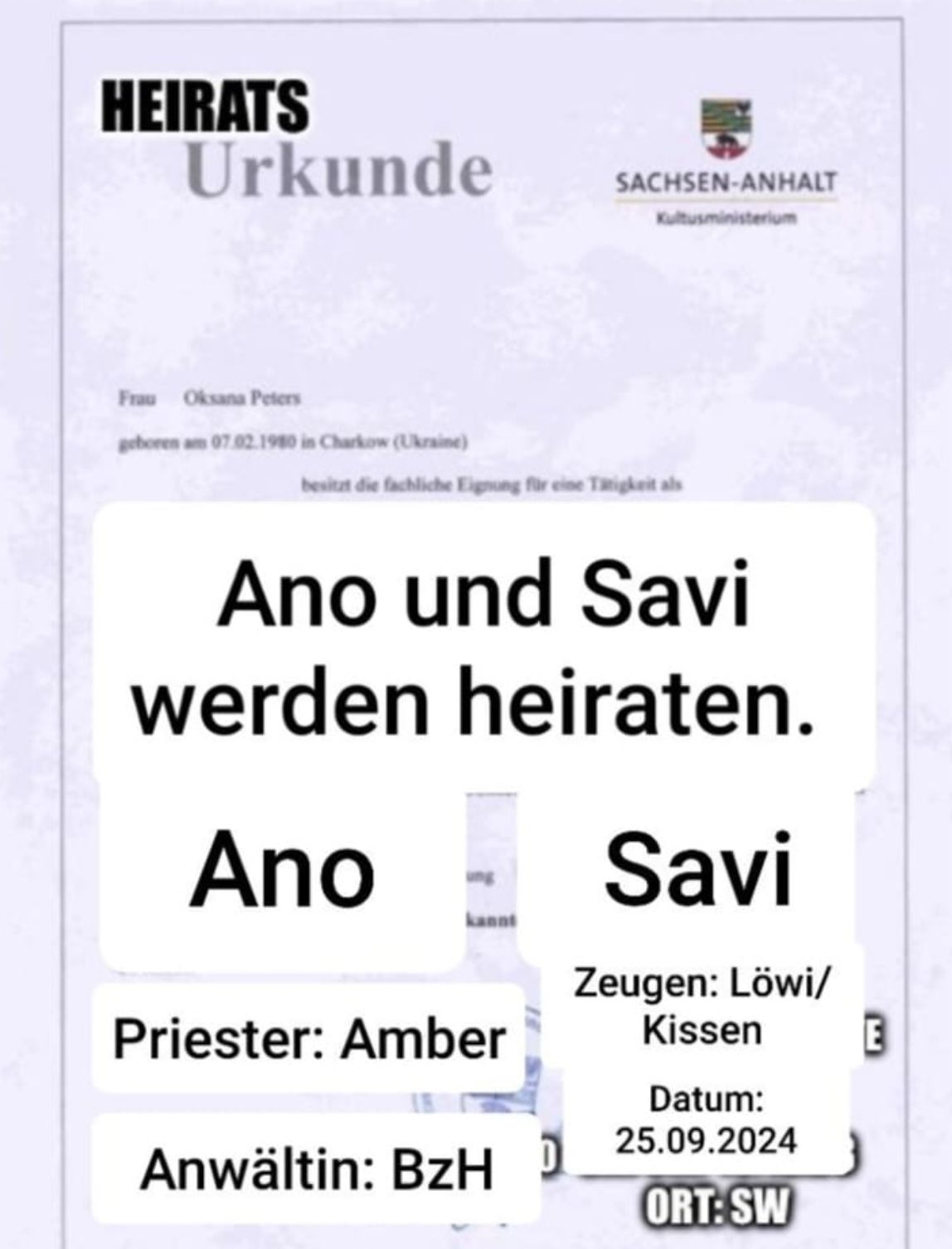 "Frau Oksana Peters, geboren am 07.02.1980 in Charkow (Ukraine) besitzt die fachliche Eignung für die Tätigkeit als 𝗔𝗻𝗼 𝘂𝗻𝗱 𝗦𝗮𝘃𝗶 𝘄𝗲𝗿𝗱𝗲𝗻 𝗵𝗲𝗶𝗿𝗮𝘁𝗲𝗻."
