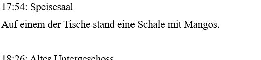 Musik hören. Und Obst essen. Dann gucke ich, ob ich bisschen weiter schreibe, da ich wahrscheinlich am Höhepunkt der Spannung angekommen bin.