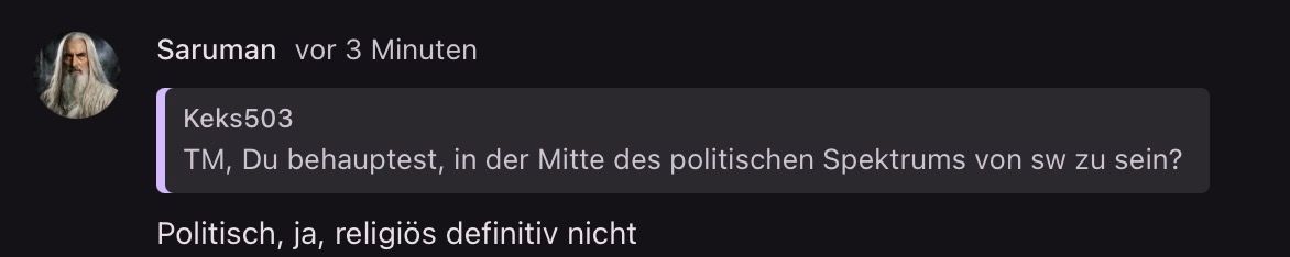 Ich habe schon verstanden, dass Du Dich politisch mittig nennst, aber das ändert nichts an meinem Einwand, dass „Mittig“ keine feste Position ist, sondern sich ständig je nachdem verändert, was auf beiden Seiten liegt