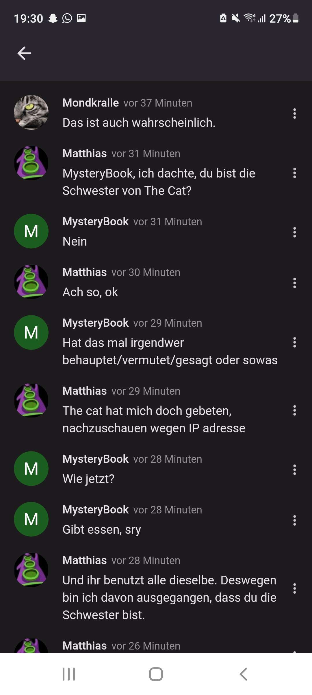 Ich hab das Gefühl Mystery Book ist The cat, weil sie mich auch nur kritisiert und sie kam 2 Tage später wieder als The cat gegangen ist und beim letzten mal war The cat nicht angemeldet